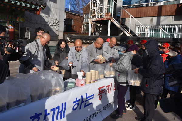 총무원장 상진 스님과 집행부 스님들이 시민들에게 동지팥죽 나눔봉사를 펼치고 있다. 한국불교태고종 총무원(총무원장 상진…